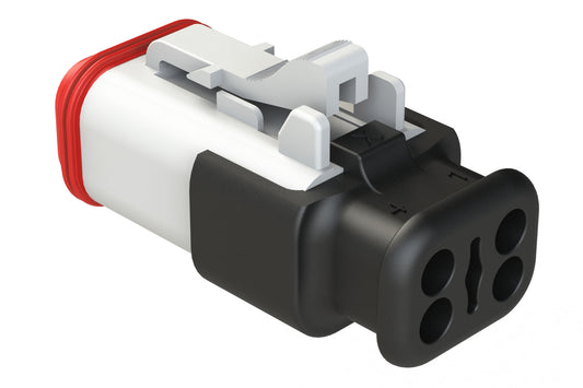 AT06-4S-SR02BLK 4-Way Plug, Female Connector with Reduced Diameter Seal (E-Seal), Strain Relief Endcap, Black. DT06-4S-CE12