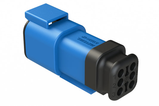 ATM04-6P-SR01BL 6 Position, Receptacle, Pin, Standard Diameter Rear Seal (Red), SR01 Strain Relief, Blue Body (Requires Wedgelock AWM-6P.)