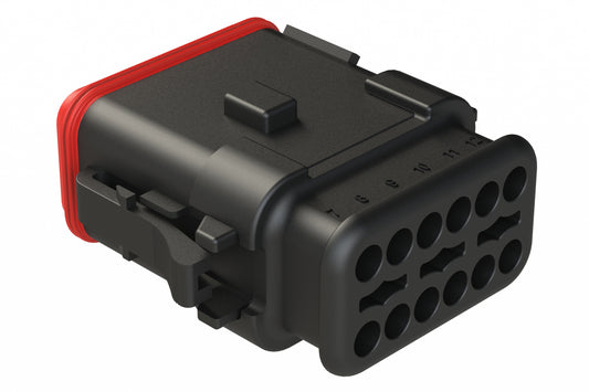AT06-12SA-SR2BK 12-Way Plug, Female Connector with A Position Key and Reduced Diameter Seal, Strain Relief Endcap, Black. DT06-12SA-CE12
