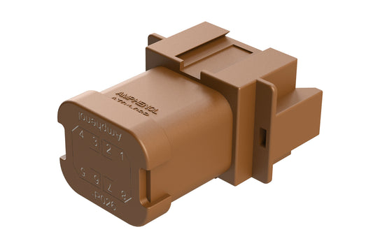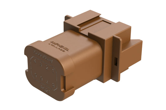 AT04-08PD-P021 8-way receptacle, (1) 8 Pin busbar=52 amps, nickel plating, keyed D, brown. Contacts included. DT04-08PD-P021