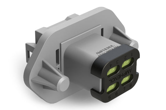 Amphenol Sine Systems’ PanelMate™ Family of receptacles are engineered with a one-piece, sealed, flanged design for rapid and secure mounting. Their durable, high-temperature, silicone, facial seal provides a barrier of protection from lubricating oils, hydraulic fluids and fossil fuels to withstand the challenges and complexities of harsh environment applications. Also available in a two-piece, sonically-welded, flange design for applications requiring an externally operated connection with 4 pass through holes. All PanelMate™ product lines accept A Series™ components and are comparable with other industry standard mating connectors.