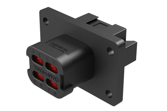 Amphenol Sine Systems’ PanelMate™ Family of receptacles are engineered with a one-piece, sealed, flanged design for rapid and secure mounting. Their durable, high-temperature, silicone, facial seal provides a barrier of protection from lubricating oils, hydraulic fluids and fossil fuels to withstand the challenges and complexities of harsh environment applications. Also available in a two-piece, sonically-welded, flange design for applications requiring an externally operated connection with 4 pass through holes. All PanelMate™ product lines accept A Series™ components and are comparable with other industry standard mating connectors.
