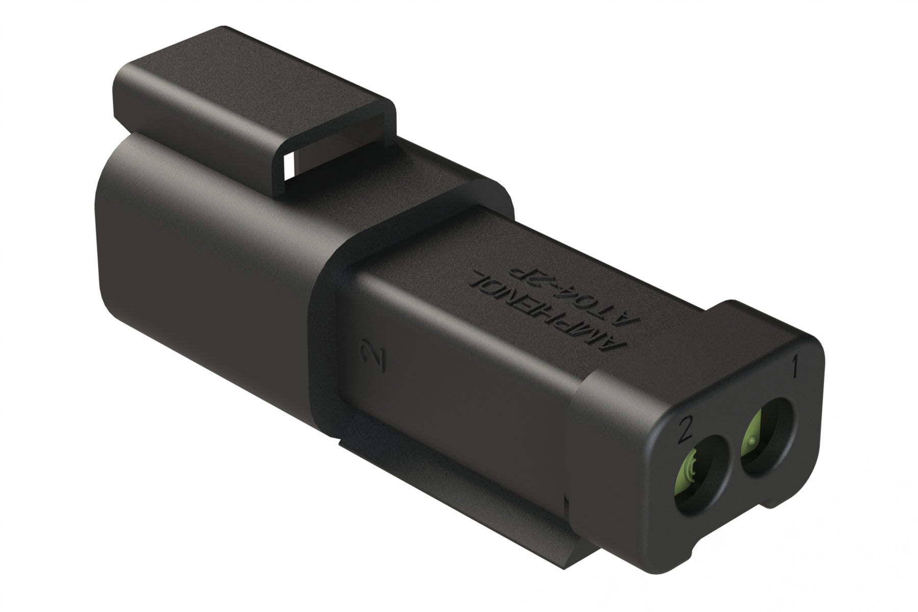 AT04-2P-MM01BLK 2-Way Receptacle, Male Connector with Reduced Diameter Seal (E-Seal) and End Cap, Black. DT04-2P-CE03