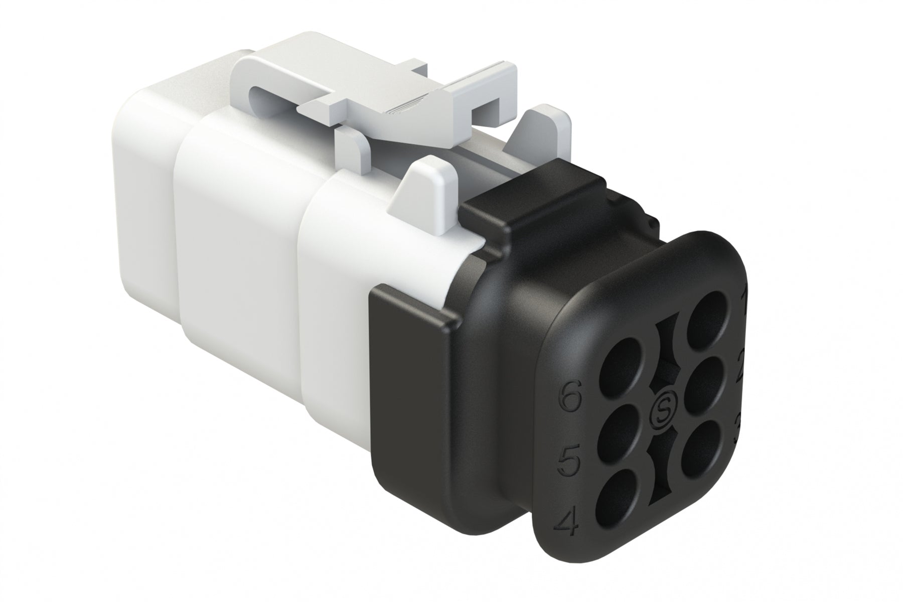 6 Position, Plug, Socket, Standard Diameter Rear Seal (Red), SR01 Strain Relief, White Body (Requires Wedgelock AWM-6S.)