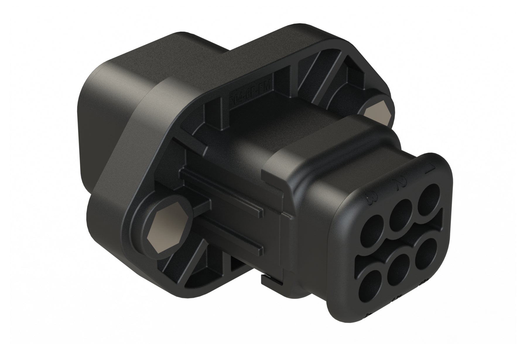 6 Position Panel Mount Receptacle with Flange, Pin, with Gasket and Threaded Insert, Endcap, Strain Relief, Standard Seal, Black