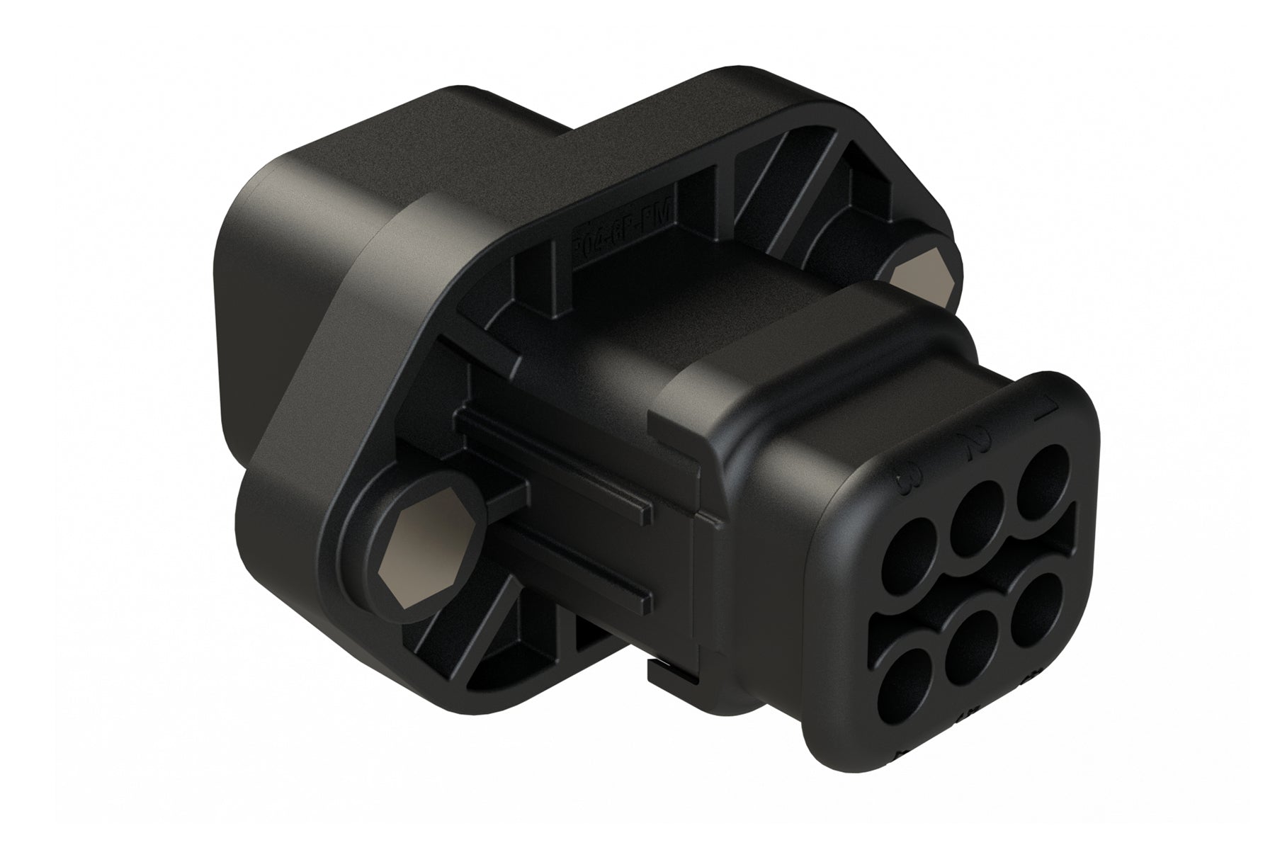 6 Position Panel Mount Receptacle with Flange, Pin, with Gasket and Threaded Insert, Endcap, Strain Relief, Reduced Diameter Seal, Black